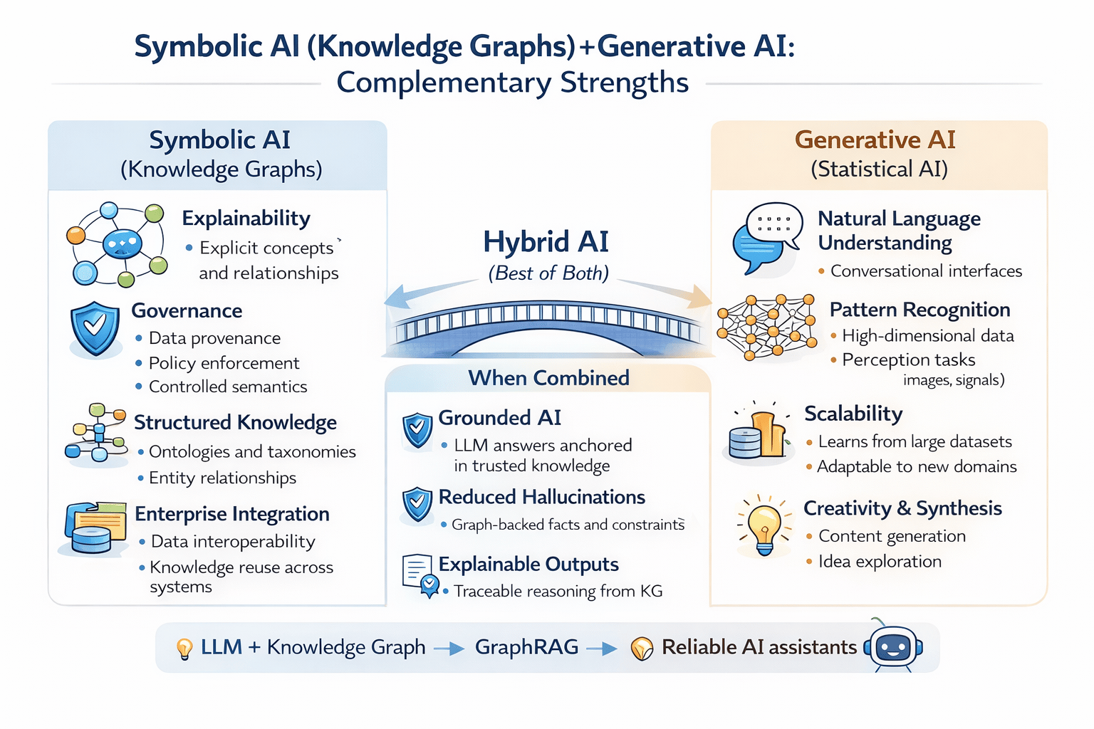 We are not arguing that Symbolic AI should replace GenAI/ML; quite the contrary! This is a “better together” story: each approach is strong in different settings, and the best systems increasingly combine them. Statistical AI excels at perception-heavy tasks, noisy signals, and high-dimensional pattern recognition, while KGs shine in regulated domains, enterprise knowledge, integration-heavy workflows, and safety-critical processes where structure, traceability, and constraints matter.