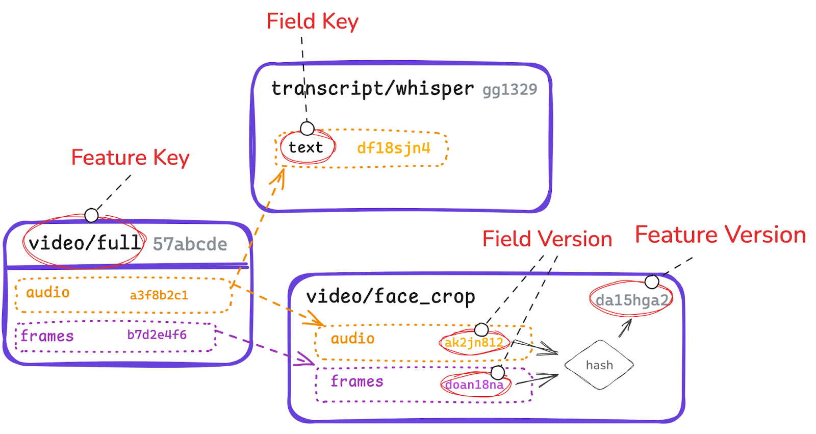 Metaxy takes a narrower, more careful view. Instead of assigning one version to a whole table or even one version to a whole sample, it tracks dependencies at the field level within each record. In practice, that means the system can see that one downstream result depends on audio while another depends only on frames.